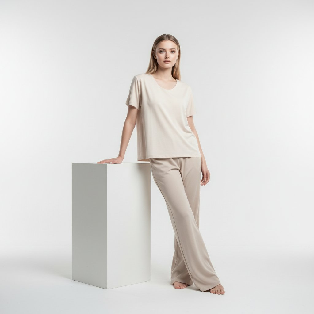 Женский портрет в минималистичной студии. Модель стоит на белом фоне циклорамы, одета в светлую свободную футболку и широкие бежевые брюки. Одна рука опирается на высокий белый куб. Корпус немного развернут к камере, взгляд прямой и уверенный. Мягкое, рассеянное освещение подчеркивает чистоту образа.