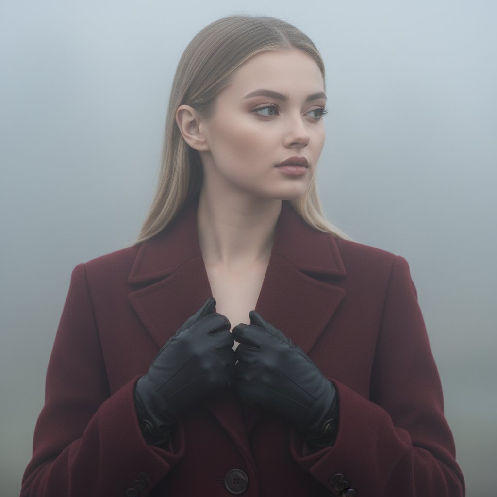 Крупным планом портрет женщины в элегантном бордовом пальто и кожаных перчатках. Она держит руки перед собой, взгляд устремлен в сторону. Фигура окутана мягким туманом, создавая размытые контуры. Естественное освещение подчеркивает глубокий цвет пальто и атмосферу дымки.