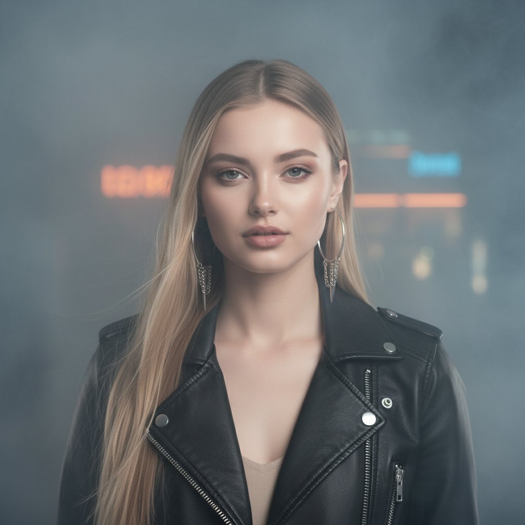 Крупный план женского лица в кожаной куртке и массивных серьгах. Она стоит в тумане, сквозь который пробиваются приглушенные огни. Взгляд прямой, выражение лица дерзкое. Мягкое освещение подчеркивает ее силуэт.