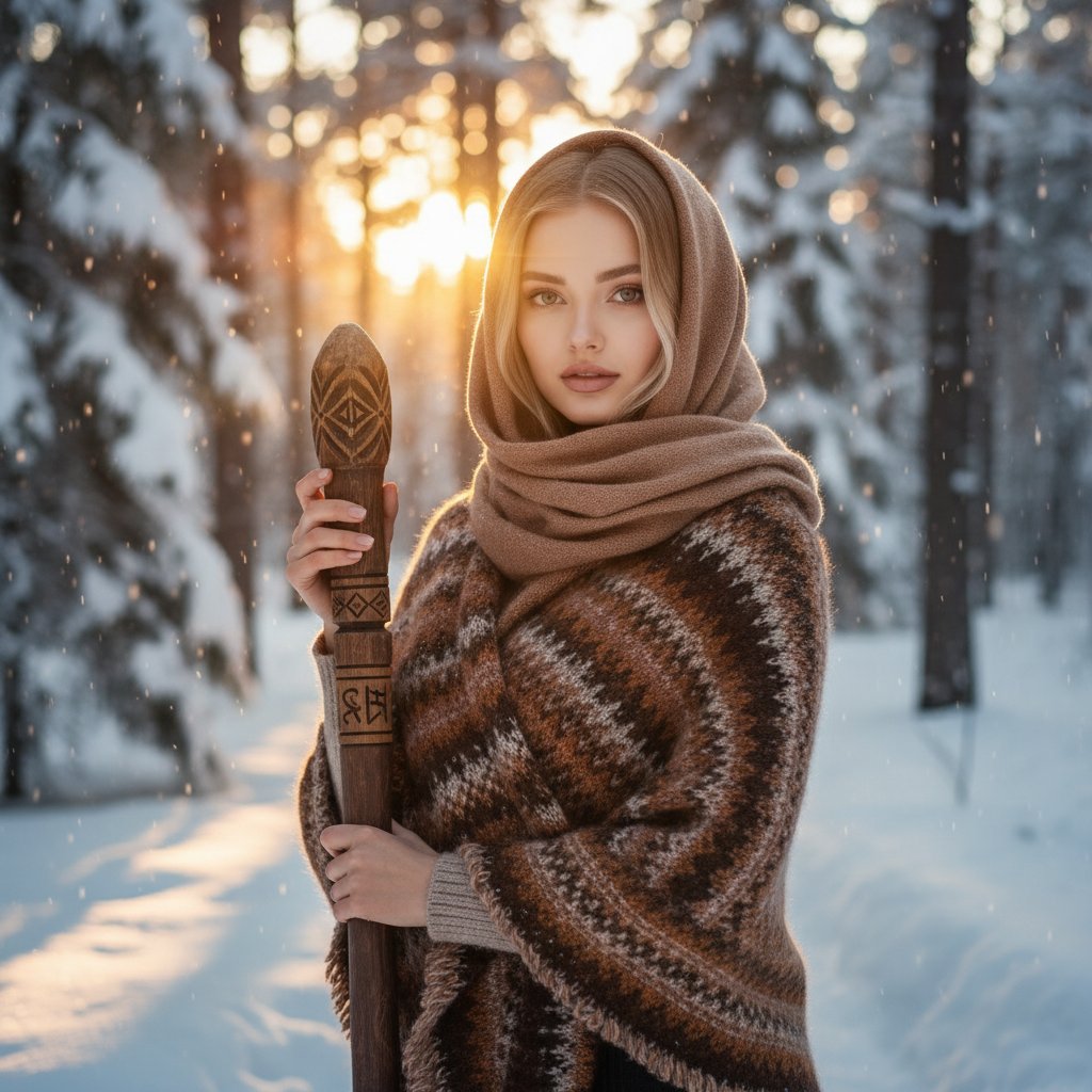 Женщина в уютной накидке и платке позирует на фоне заснеженного леса в лучах заката, опираясь на резной посох, взгляд направлен в объектив