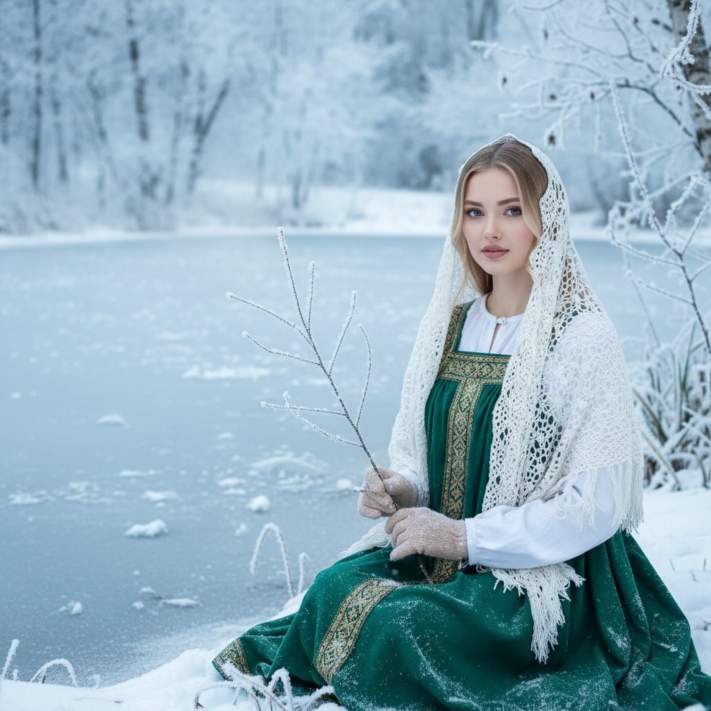 Юная особа в изумрудном сарафане с узорами, в ажурном белом платке, расположилась на опушке застывшего лесного водоёма. В руках она держит тонкую ветвь берёзы, взгляд направлен в объектив. Вся местность украшена морозными узорами на деревьях, создавая волшебное зимнее настроение.