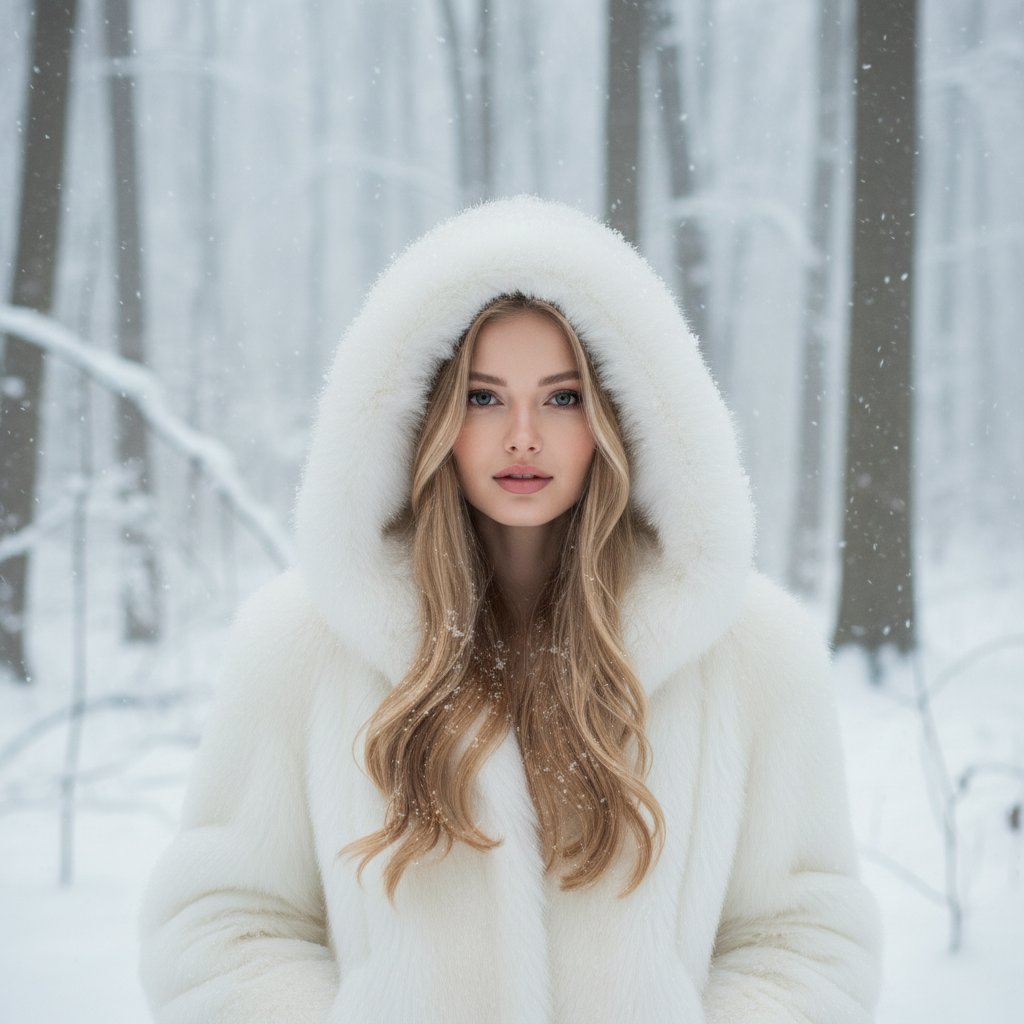 Портрет женщины среднего плана в заснеженном лесу, одетой в элегантную белую шубу из длинноворсового меха с пышным капюшоном. Она смотрит прямо в объектив, ее волосы свободно ниспадают мягкими локонами, а макияж едва заметен. Сцена передает атмосферу винтажного модного журнала, подчеркивая контраст между нежной текстурой меха и суровой красотой зимнего пейзажа.