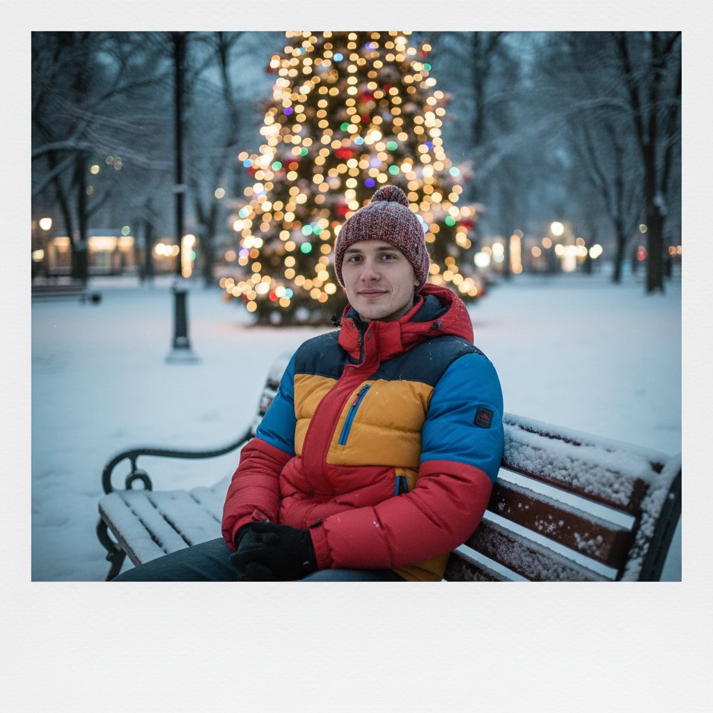 Снимок в стиле Полароид: мужчина в красочной куртке и шапке отдыхает на скамье в заснеженном парке, позади него мерцают огни рождественской ели.