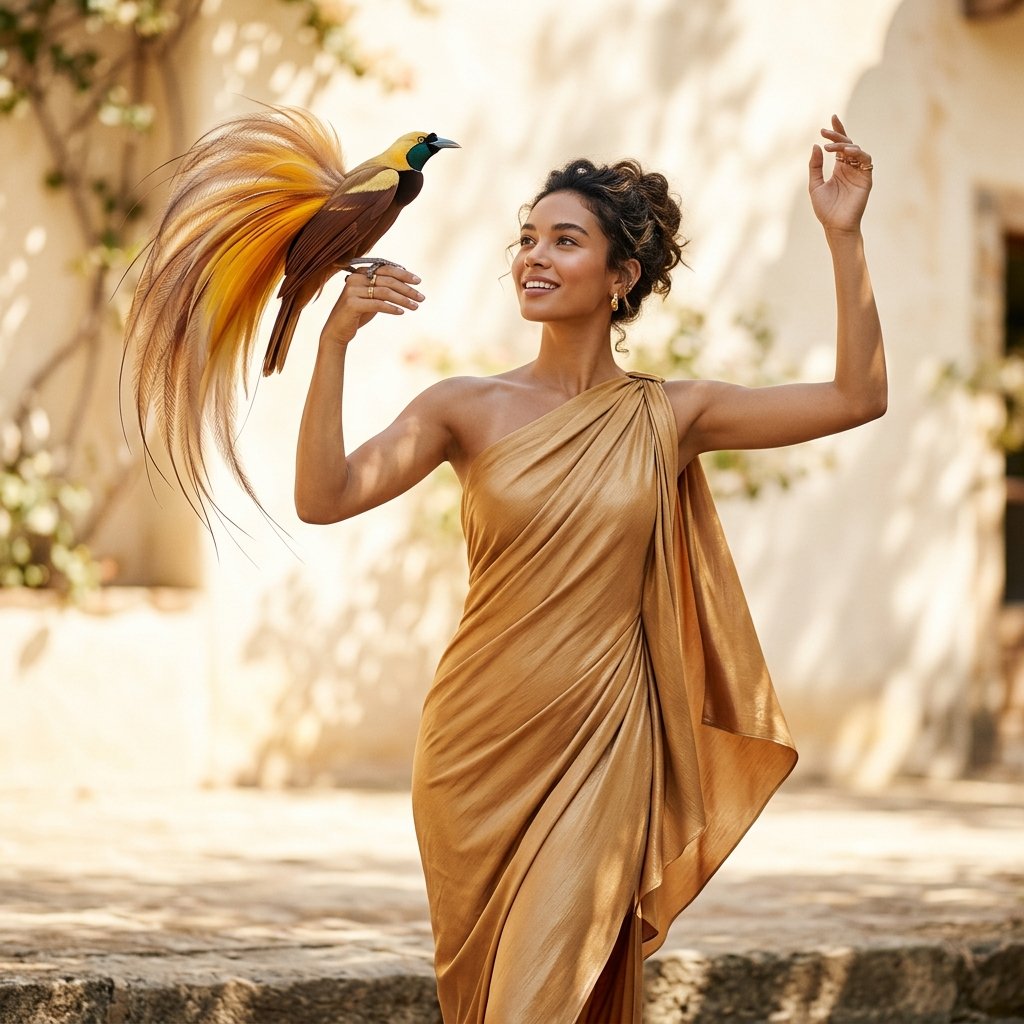 NanoBanana 2Создай портрет, не меняя черты лица. Фэшн-фотография модели с экзотической райской птицей с длинными декоративными перьями в золотисто-оранжевых оттенках. Она поднимает руку, словно повторяя движение птицы. На женщине эффектный наряд в тёплых золотых тонах: асимметричное платье с драпировкой и лёгким блеском. Тёплая монохромная палитра, светлый фон с мягкими солнечными тенями. Гиперреалистичный стиль высокой моды, 8k, высокая детализация. 9:16